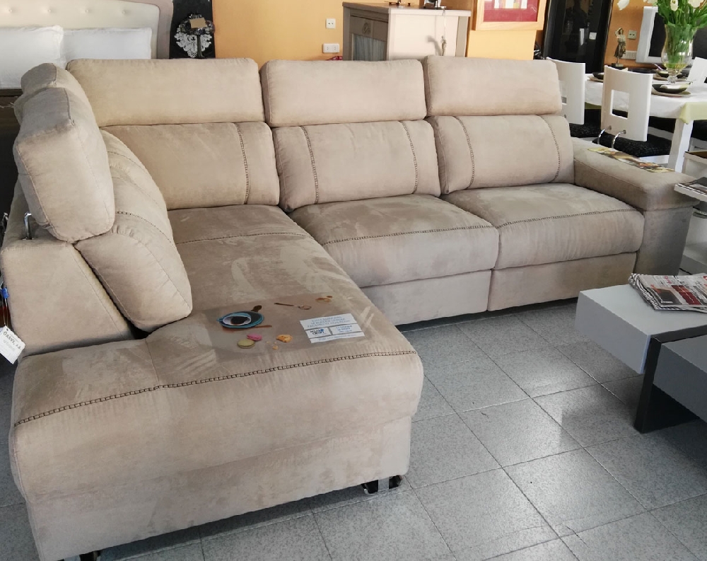 Amplio sofá tapizado en colores suaves y con detalles en cosido.
